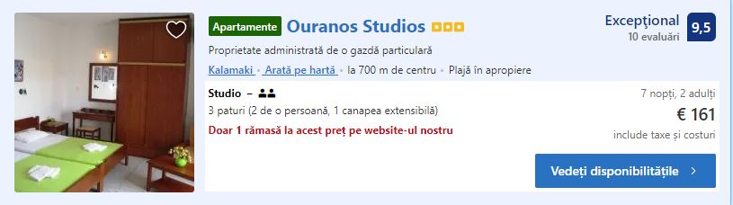 - Cazare 3: Ouranos Studios – 161 euro / 7 nopti / camera dubla