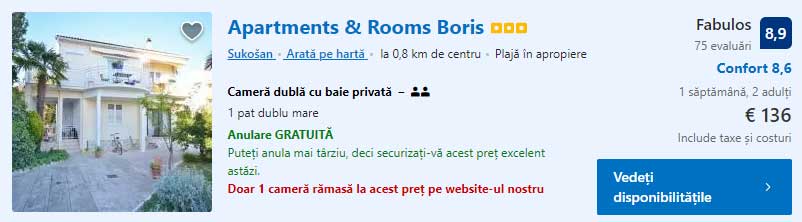 - Cazare 1: Apartments & Rooms Boris (Sukošan) – 136 euro / 7 nopti / camera dubla