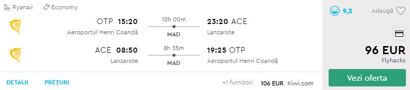 - Zbor: Bucuresti – Lanzarote, 102 euro, dus-intors, operat de Ryanair, garantie Kiwi