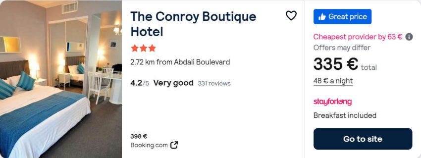 - Cazare (opt. 3): The Conroy Boutique Hotel – 335€/ 7 nopti / camera dubla / mic dejun inclus