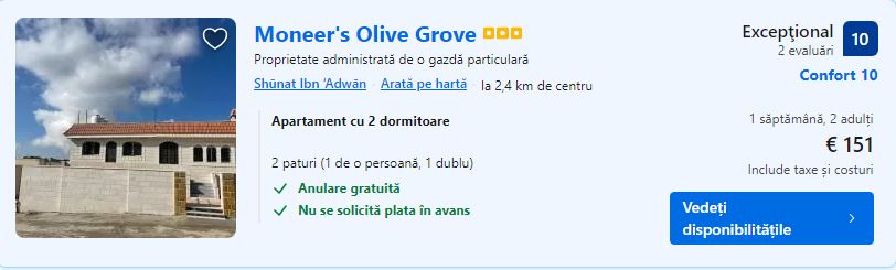 - Cazare: Moneer’s Olive Grove – 151 euro / 7 nopti / apartament cu doua dormitoare