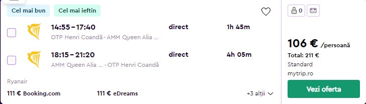 - Zbor: Bucuresti – Amman, 106 euro, dus-intors, operat de Ryanair