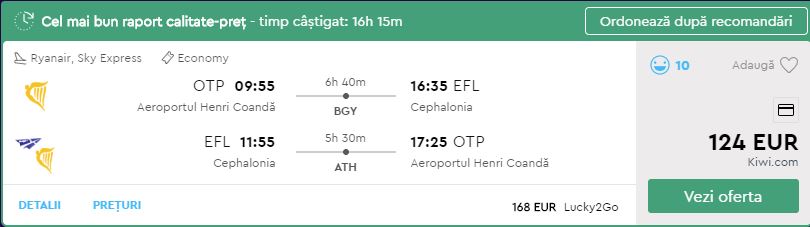 - Zbor: Bucuresti – Kefalonia, 124 euro, dus-intors, garantie Kiwi