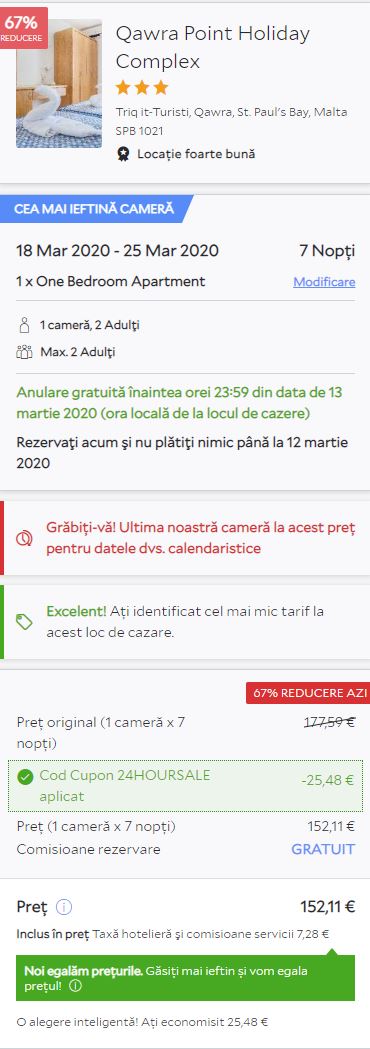 - Cazare 1: Qawra Point Holiday Complex – 152 euro / 7 nopti / camera dubla