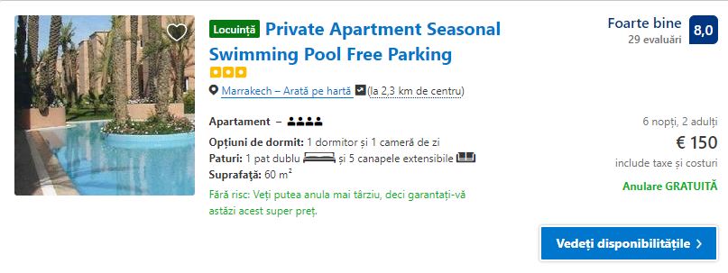 - Cazare 1: Private Apartment Seasonal Swimming Pool – 150 euro / 6 nopti / camera dubla