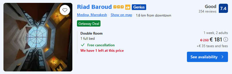 - Cazare (opt. 1): Riad Baroud – 216€/ 7 nopti / camera dubla