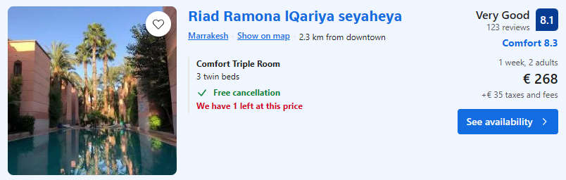 - Cazare (opt. 2): Riad Ramona lQariya seyaheya – 303€ / 7 nopti / camera dubla
