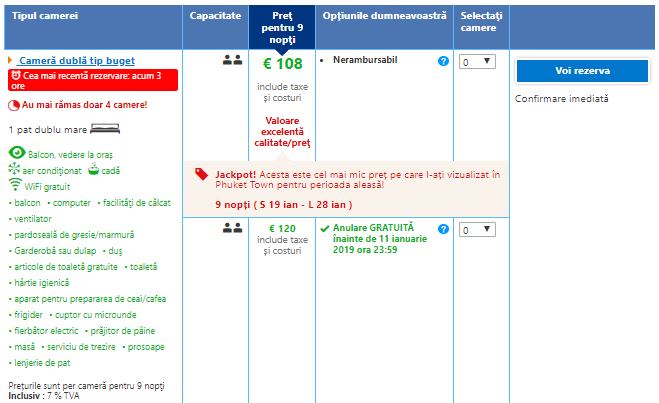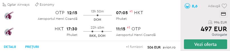 - Zbor: Bucuresti – Phuket, 497 euro, dus-intors, operat de Qatar Airways, bagaj de cala inclus
