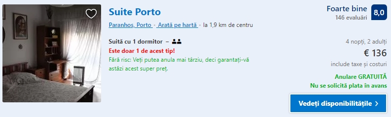 - Cazare 3: Suite Porto – 136 euro / 4 nopti / camera dubla