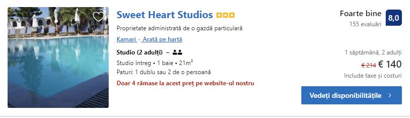 - Cazare 1: Sweet Heart Studios – 140 euro / 7 nopti / camera dubla