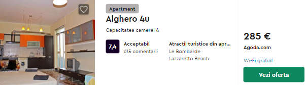 - Cazare (opt.1) Alghero 4u – 285 euro / 7 nopti / camera dubla