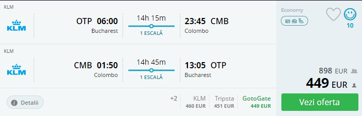 - Zbor: Bucuresti – Colombo, 449 euro, dus-intors, operat de KLM (bagaj de cala inclus)