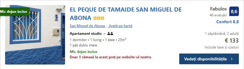 - Cazare 1: El Peque de Tamaide – 133 euro / 7 nopti / camera dubla / mic dejun inclus