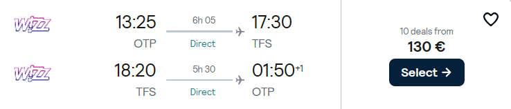 - Zbor: Bucuresti – Tenerife, 130€, dus-intors, operat de Wizz Air