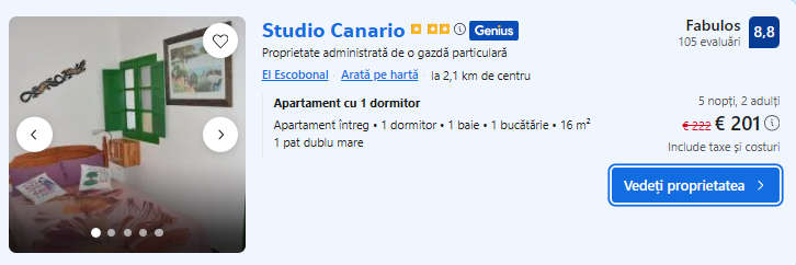 - Cazare (opt. 1): Studio Canario – 201€ / 5 nopti / camera dubla
