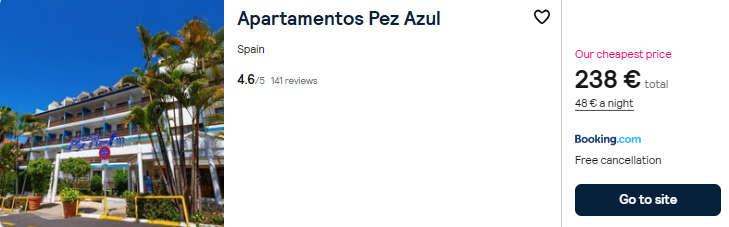 - Cazare (opt. 2): Apartamentos Pez Azul – 238€ / 5 nopti / camera dubla