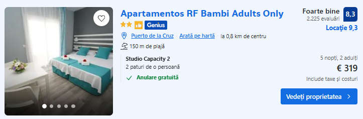 - Cazare (opt. 2): Apartamentos RF Bambi Adults Only – 319€ / 5 nopti / camera dubla