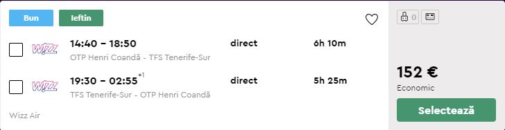 - Zbor: Bucuresti – Tenerife, 152 euro, dus-intors, operat de Wizz Air