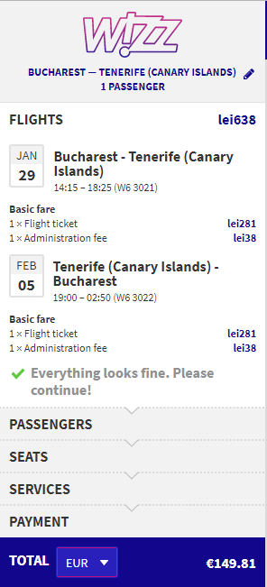 - Bucuresti – Tenerife, 150 euro, dus-intors, operat de Wizz Air