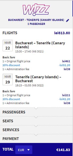 - Zbor: Bucuresti – Tenerife, 141 euro, dus-intors, operat de Wizz Air (zbor cu 20% reducere daca rezervi astazi, 10 ianuarie 2019)