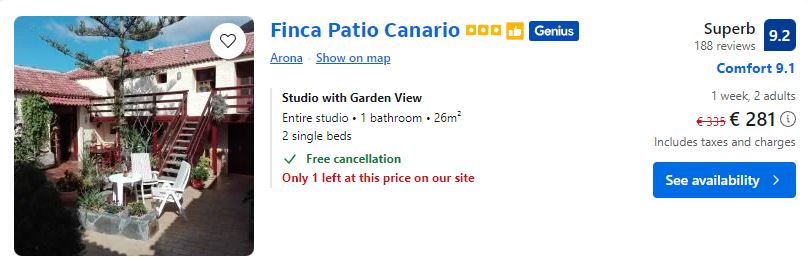 - Cazare (opt. 3): Finca Patio Canario – 281 euro / 7 nopti / camera dubla