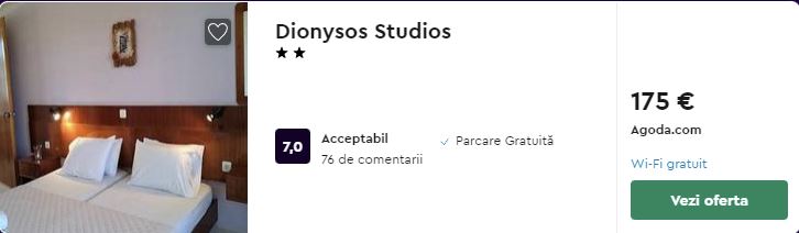 - Cazare (opt. 2): Dionysos Studios – 175 euro / 7 nopti / camera dubla