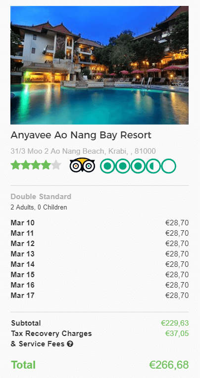 - Anyavee Ao Nang Bay Resort (cotat cu 8.1/10 pe Booking) – 267 euro / 8 nopti / camera dubla