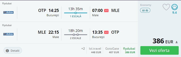 - Bucuresti – Male, 386 euro, dus-intors, operat de Flydubai (bagaj de cala inclus)