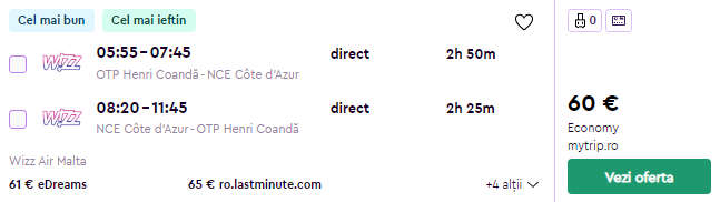 - Zbor Bucuresti – Nisa, 60 euro, dus-intors, operat de Wizz Air