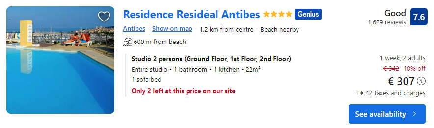 - Cazare (opt.1) Residence Residéal Antibes – 349 euro / 7 nopti / camera dubla