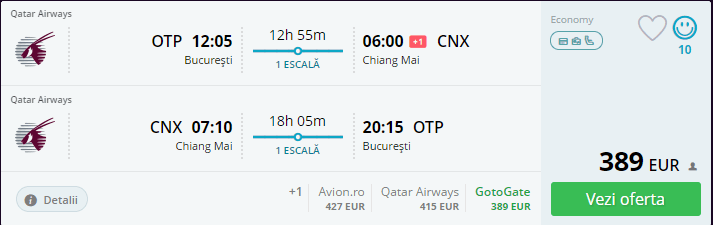 - Bucuresti – Chiang Mai, 389 euro, dus-intors, operat de Qatar Airways
