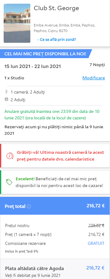 - Cazare 2: Club St George – 217 euro / 7 nopti / camera dubla