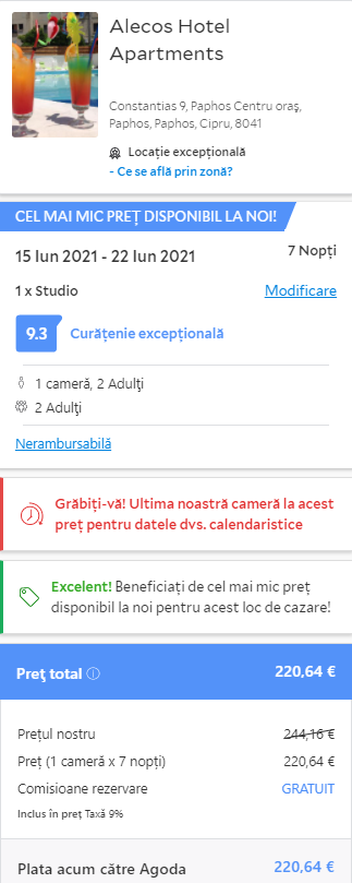 - Cazare 3: Alecos Hotel Apartments – 221 euro / 7 nopti / camera dubla