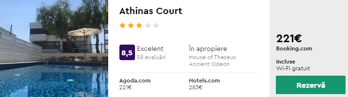 - Cazare 1: Athinas Court – 221 euro / 7 nopti / camera dubla