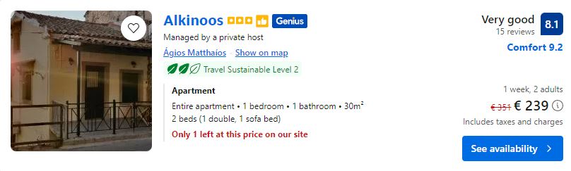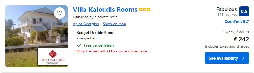 - Cazare (opt. 2): Villa Kaloudis Rooms – 242 euro / 7 nopti / camera dubla
