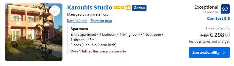 - Cazare (opt. 4): Karoubis Studio – 298 euro / 7 nopti / camera dubla
