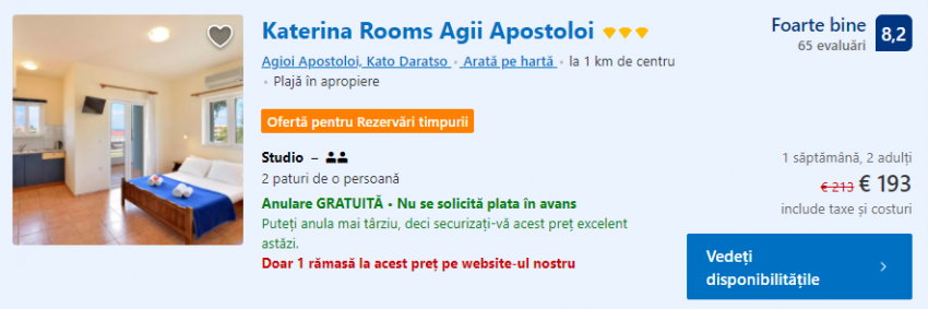 - Cazare 1: Katerina Rooms Agioi Apostoloi – 193 euro / 7 nopti / camera dubla