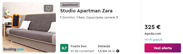 - Cazare (opt. 2) Studio Apartman Zara – 325 euro / 7 nopti / camera dubla