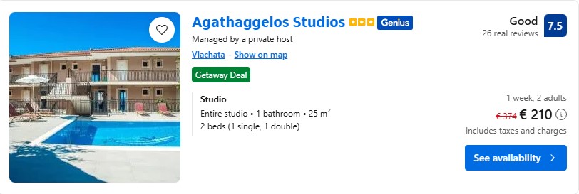 - Cazare (opt. 1): Agathaggelos Studios – 210 euro / 7 nopti / camera dubla