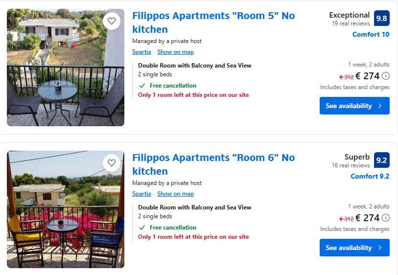 - Cazare (opt. 2/3): Filippos Apartments “Room 5” (sau 6, acelasi pret) – 274 euro / 7 nopti / camera dubla cu balcon si vedere la mare