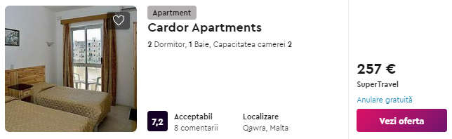 - Cazare (opt.1) Cardor Apartments – 257 euro / 7 nopti / camera dubla