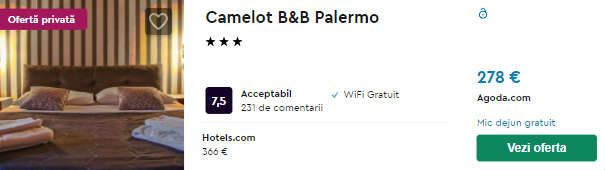 - Cazare (opt.1) Camelot B&B Palermo – 278 euro / 7 nopti / camera dubla / mic dejun inclus