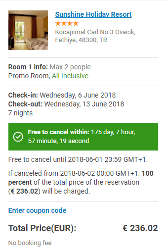 - Sunshine Holiday Resort 4* (cotat cu 4/5 pe TripAdvisor) – 236 euro / 7 nopti / camera dubla / all inclusive