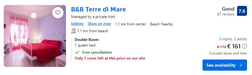 - Cazare (opt. 2 – Salerno): B&B Terre di Mare – 161 euro / 3 nopti / camera dubla