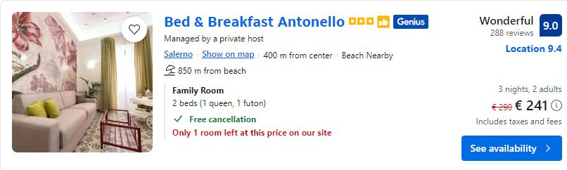 - Cazare (opt. 3 – Salerno): Bed & Breakfast Antonello – 241 euro / 3 nopti / camera dubla