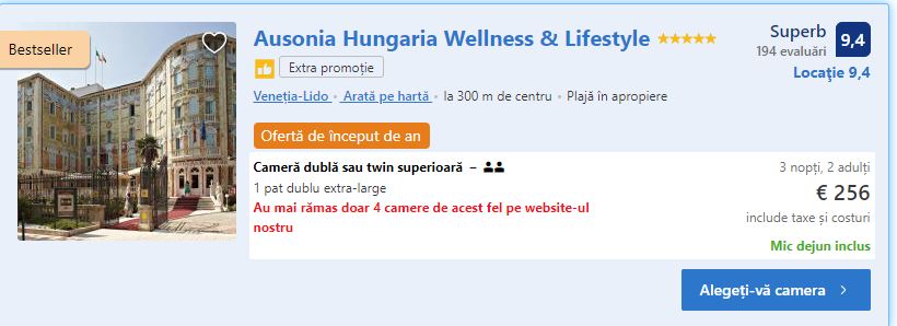 - Cazare 1: Ausonia Hungaria 5* – 256 euro / 3 nopti / camera dubla / mic dejun inclus