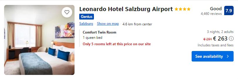 - Cazare (opt. 1): Leonardo Hotel Salzburg Airport 4* – 263 euro / 3 nopti / camera dubla