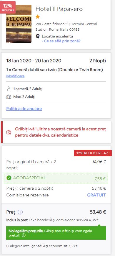 - Cazare 2: Hotel Il Papavero – 53 euro / 2 nopti / camera dubla