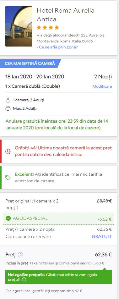 - Cazare 3: Hotel Roma Aurelia Antica 4* – 62 euro / 2 nopti / camera dubla