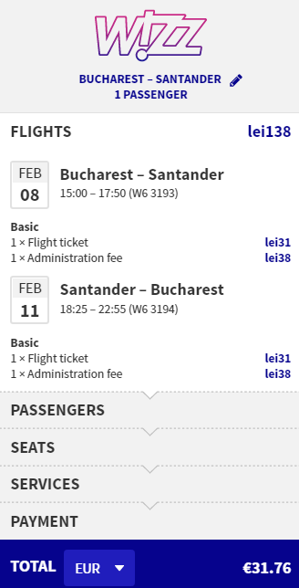 - Zbor: Bucuresti – Santander, 32 euro, dus-intors, operat de Wizz Air
